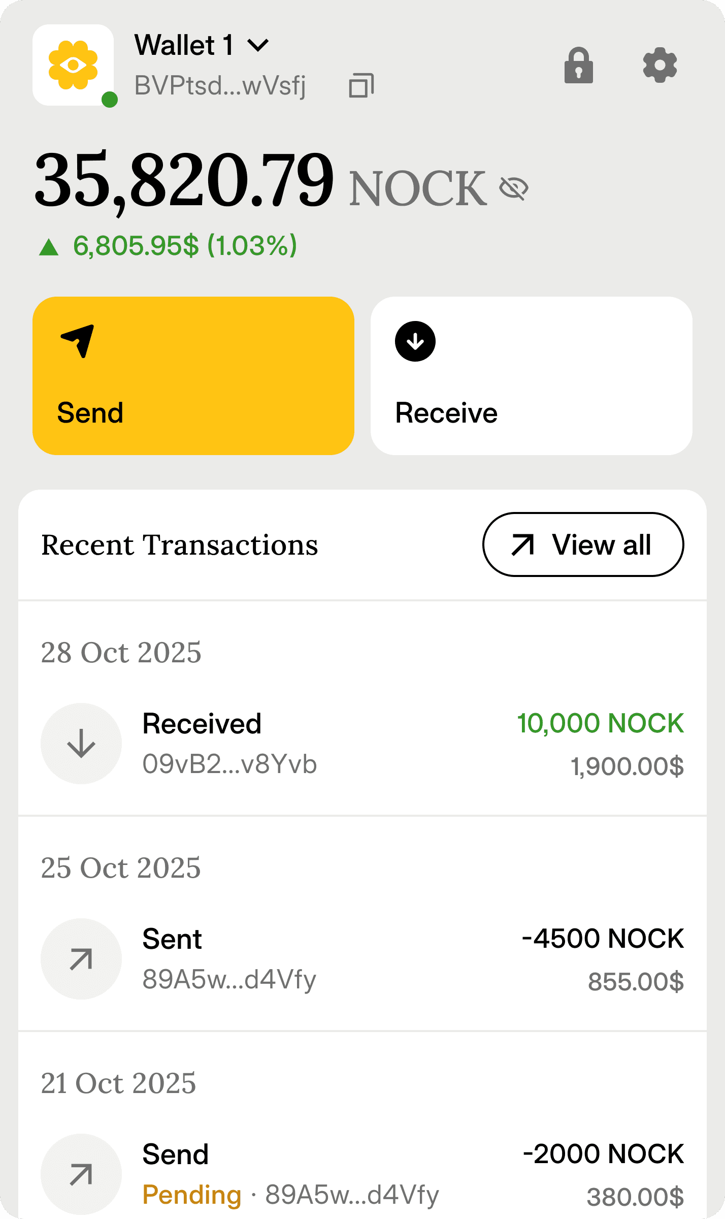 Meet Iris. Your simple wallet for Nockchain. Send NOCK, connect to apps with Iris Connect, import your existing wallet or create new ones. Your keys stay local, always. And we're just getting started.